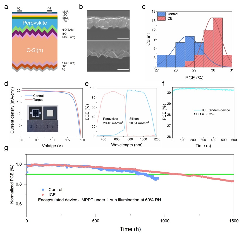 J-V曲线测量全面验证ICE策略优异效果。宽能隙钙钛矿太阳能电池冠军器件实现22.64% PCE、1.280 V VOC(超过SQ极限93%)、21.26 mA/cm² JSC、83.20% FF,相比对照组(21.24% PCE、1.224 V VOC)显着提升。叠层电池表现更加出色:冠军ICE叠层器件逆扫描PCE高达30.65%并获得30.5%独立认证效率,平均PCE达30.01%,显着高于对照组28.71%。稳态功率输出达30.3%,展现优异的稳定性表现。
